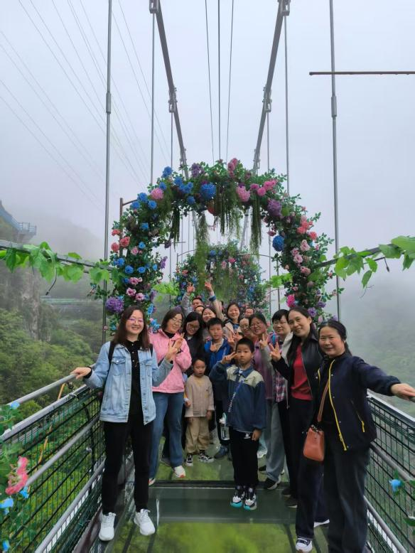 雨后的景区空气清新,生机盎然,鲜花浪漫,令人心旷神怡,大家漫步于山林楠海,谈笑风生,感受自然之美;在飞龙玻璃桥、绝壁天梯玻璃栈道、破雾漂流等项目中,体验到惊险刺激与欢乐;在人祖文化园、红色纪念馆等场景中,大家真切感悟人文历史,传承红色基因。