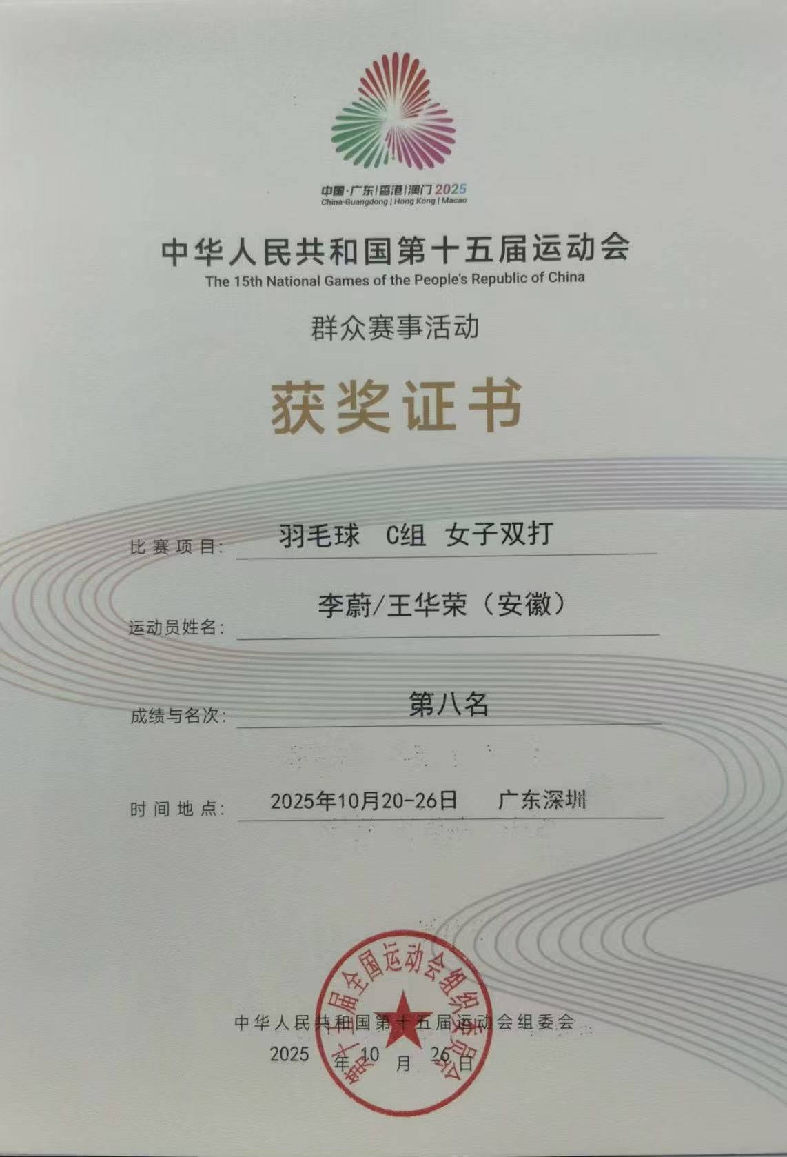 近日,从中华人民共和国第十五届全运会群众比赛羽毛球项目赛场,传来振奋人心的喜讯!我校音乐学院李蔚老师与搭档默契配合,奋勇拼搏,在竞争激烈的女子双打C组项目中,斩获全国第八名的优异成绩。这一成绩,实现了安徽省在全运会群众组羽毛球项目上“零的突破”,书写了安徽群众体育的新篇章。