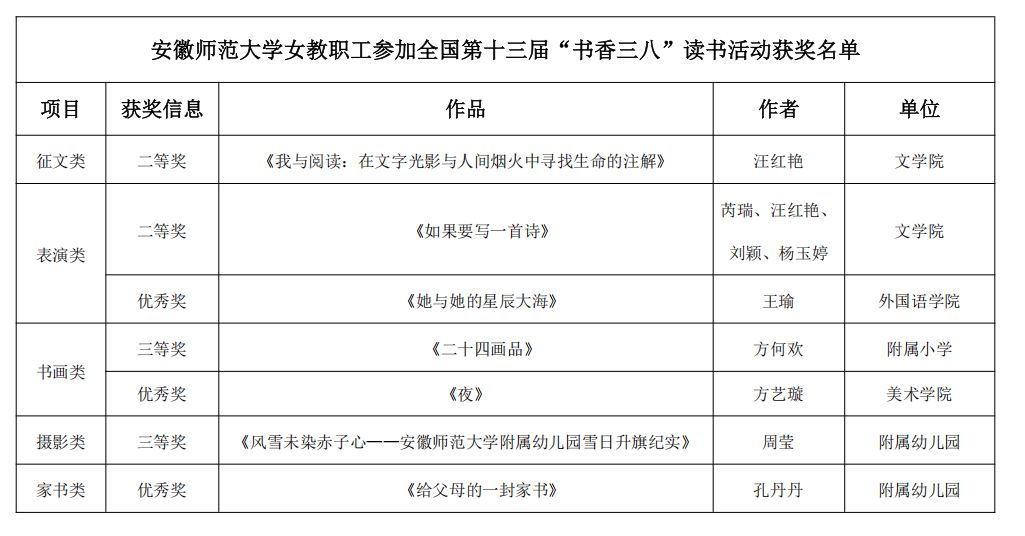 近日,以“阅读提升素养·投身强国建设”为主题的全国第十三届“书香三八”读书活动评选结果揭晓,我校报送的女教职工作品脱颖而出,共有7件作品荣获奖项,校工会再度获评“积极组织奖”,获奖总数位列安徽省内高校第一。