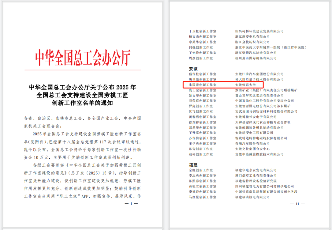 近日,中华全国总工会办公厅发文公布了全国总工会支持建设全国劳模工匠创新工作室名单,由安徽省教科文卫体工会和我校工会选树推荐的生命科学学院“朱国萍劳模创新工作室”获此殊荣。这是我省教育系统唯一获评工作室。